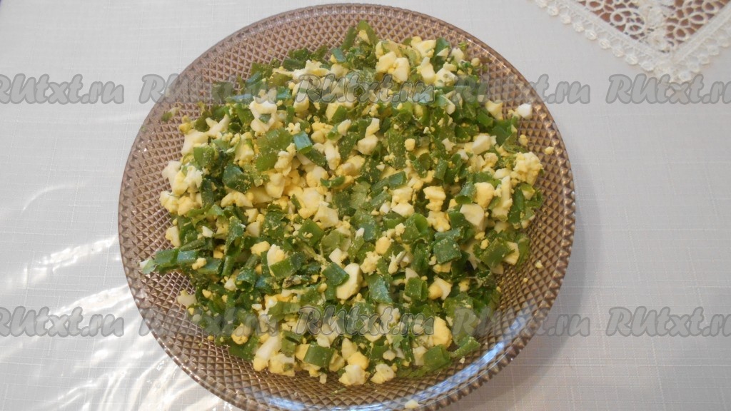 Измельчить яйца, зелень, перемешать, посолить по вкусу.