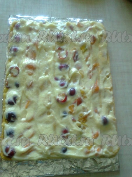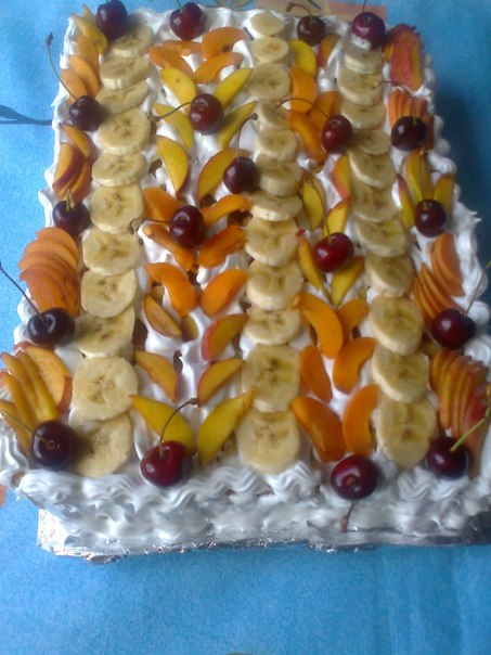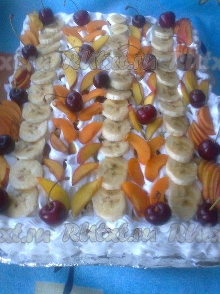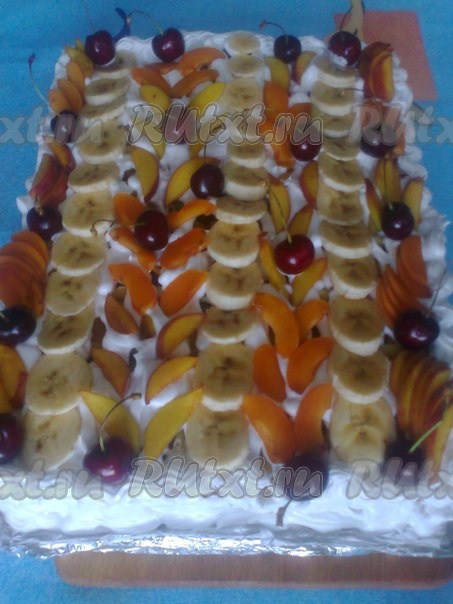 Далее все по порядку: корж-фрукты-крем.