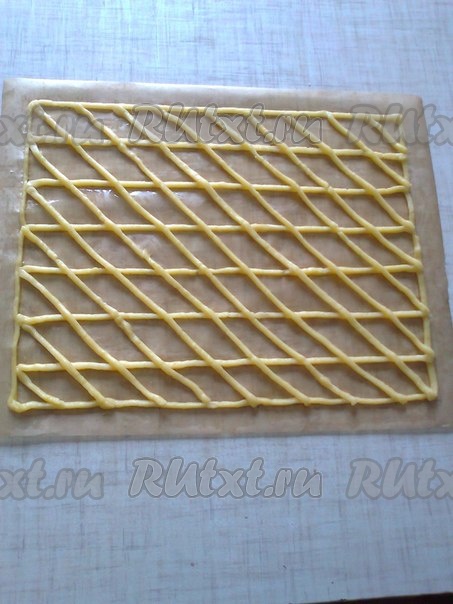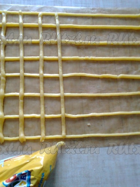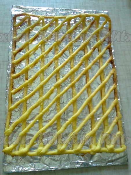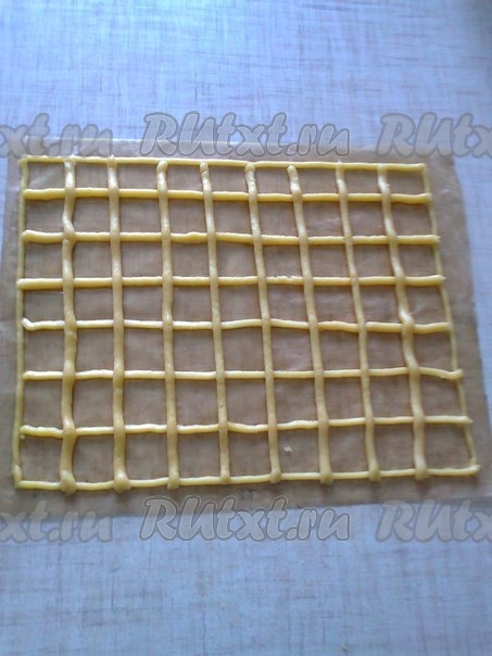 Выпекаем в разогретой духовке при температуре 180 градусов до золотистого цвета, минут 20-25. В это время делаем точно такую заготовку, но уже клетки делаем по диагонали, а затем выпекаем. Всего нам понадобится 4 коржа, 2 - с прямыми клетками и 2 - с косыми.