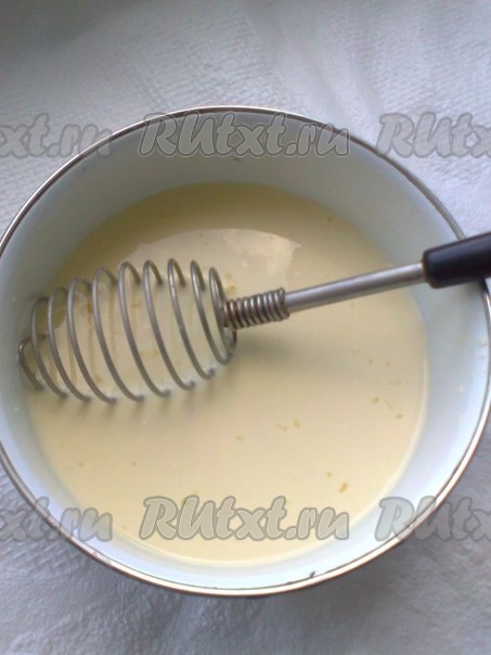 От литра молока отмеряем 0,5 стакана холодного молока. Эти полстакана молока взбиваем венчиком с яйцом, желтками и мукой.