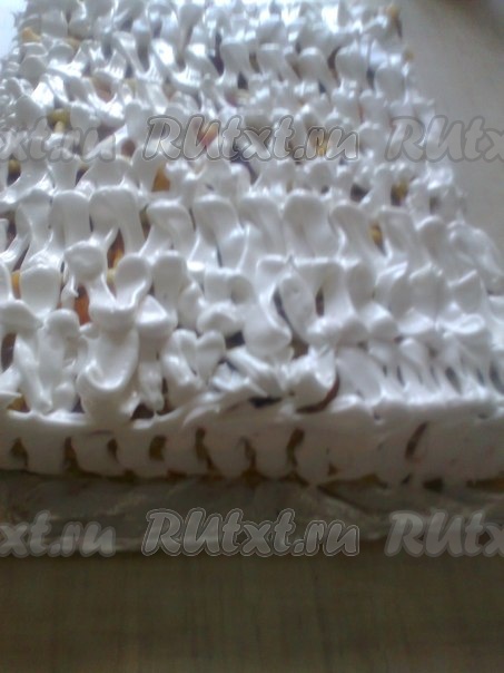 Верхний корж и бока торта оформляем белковым кремом в виде зигзагов с помощью кондитерского мешка или кулька с отрезанным уголком.