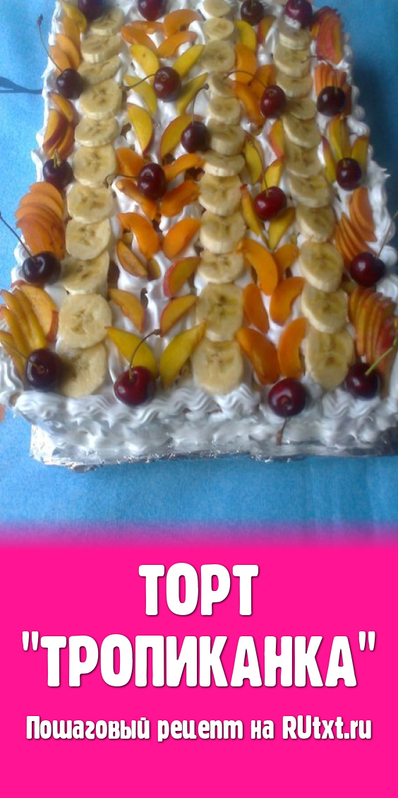 Торт, в котором очень мало теста и очень много фруктов, ну ни сказка ли это? Оказывается, такой торт есть и называется он "Тропиканка". Сейчас в магазинах  в любое время года  можно купить свежие фрукты, поэтому такой торт можно приготовить и зимой, для него прекрасно подойдут и замороженные фрукты или фрукты из домашних заготовок. Торт состоит из коржей, приготовленных из заварного теста, переложен фруктами и промазан заварным кремом, сверху украшен белковым кремом и фруктами. Торт получается большой, поэтому если семья небольшая, пропорции можно уменьшить вдвое. Приготовление торта не сложное, но трудоемкое, поэтому если кто-то из семьи сможет помочь вам, получится намного быстрее, помощниками могут быть и дети.