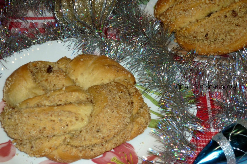 Сформировать из "косы" веночек. Аналогично сформировать булочку с орехами и изюмом из второй части дрожжевого теста.