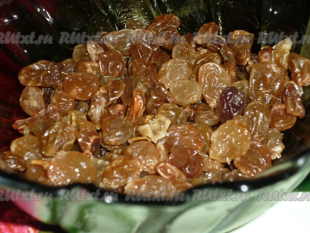 Для приготовления начинки изюм промыть водой, переложить в достаточно глубокую миску, залить кипятком и оставить на 8-10 минут, затем воду слить, а изюм обсушить, выложив на полотенце.
