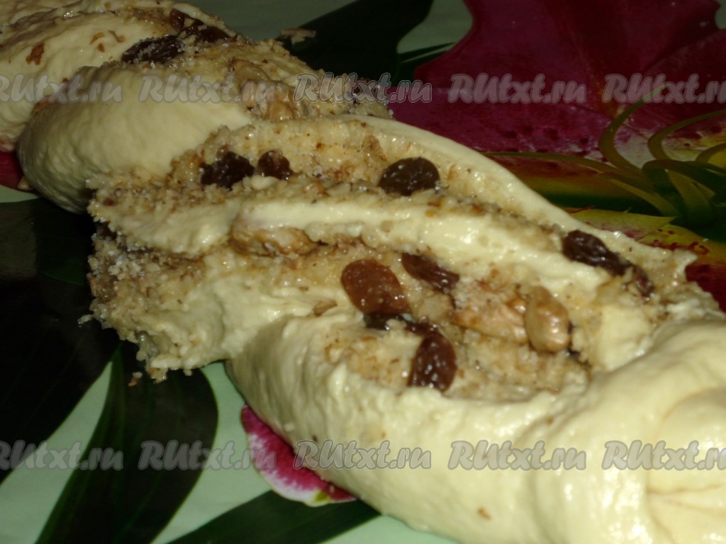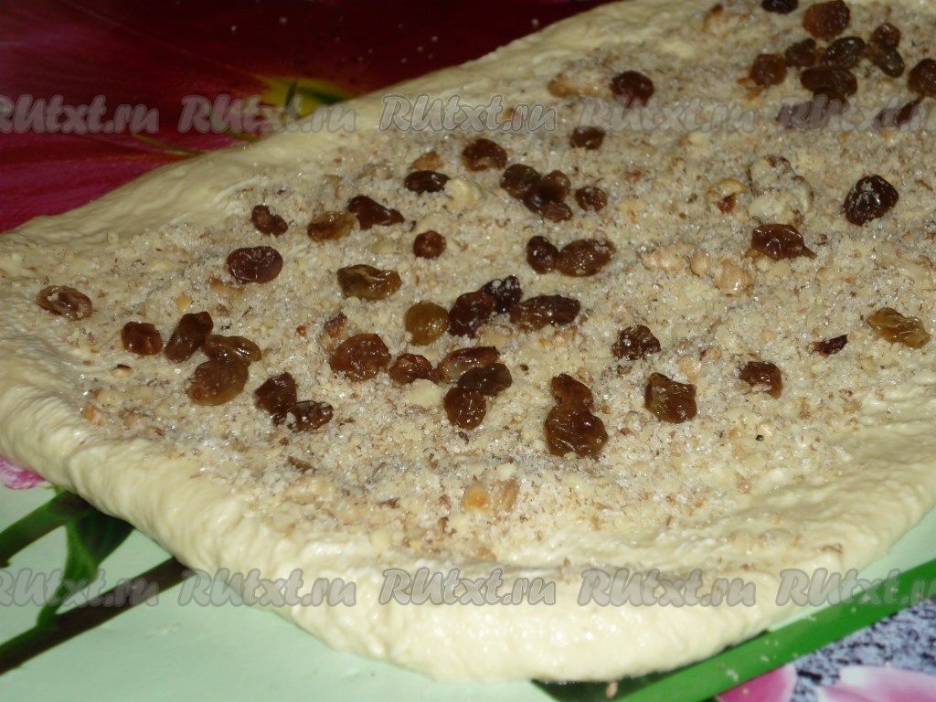 Подошедшее тесто разделить на две части. Вначале одну часть теста на присыпанной мукой поверхности раскатать в прямоугольник (тонко раскатывать не нужно), смазать 25 граммами сливочного масла, затем, отступив немного от краёв прямоугольника, посыпать половиной ореховой смеси и половиной изюма.