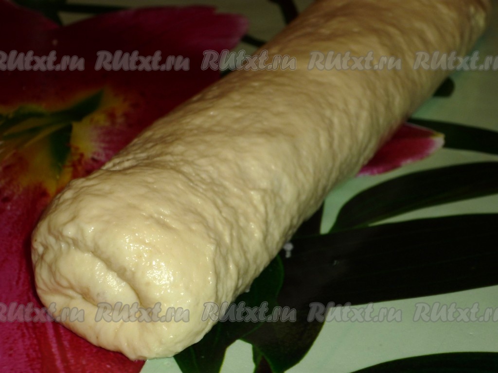 Свернуть пласт теста в рулет, начиная с широкой стороны, и защипнуть края.