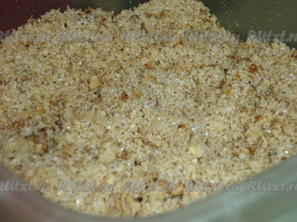 Орехи подсушить на среднем огне, помешивая, на сухой сковороде, затем остудить их и измельчить в блендере. Смешать измельчённые орехи с сахаром. Сливочное масло для начинки должно быть комнатной температуры, поэтому из холодильника его нужно будет достать заранее.