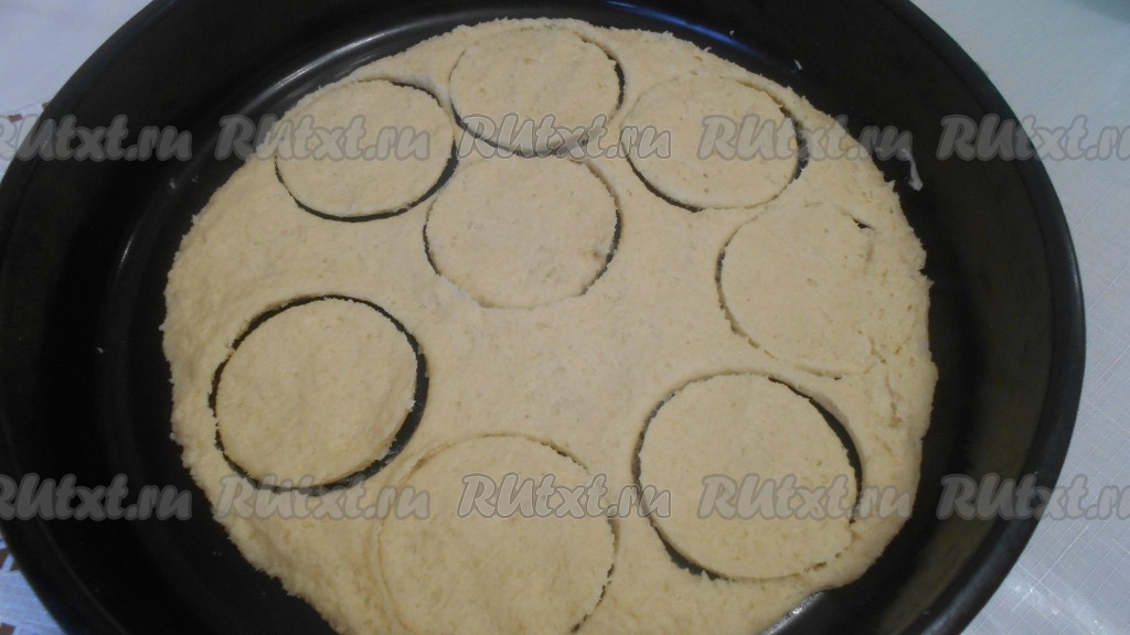 Затем на сухой противень руками распределить половину теста (хоть тесто и липнет, ни в коем случае не подсыпать муку), затем вырезать круги, излишки теста убрать. Аналогично поступить со всем оставшимся тестом.