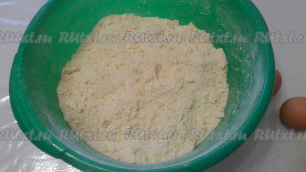 Маргарин, муку и сахар растереть в крошку и добавить разрыхлитель и ванилин.