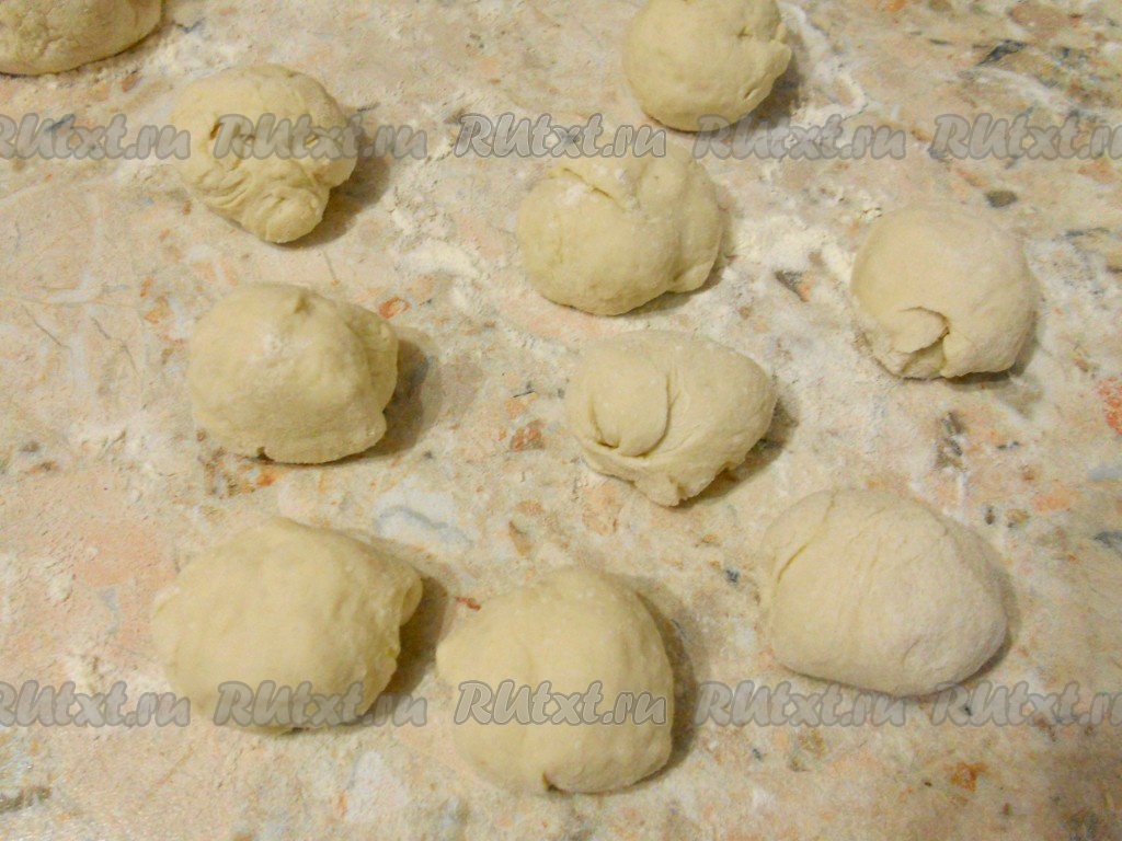 Тесто разделить на маленькие кусочки, которые скатать в шарики размером с грецкий орех.
