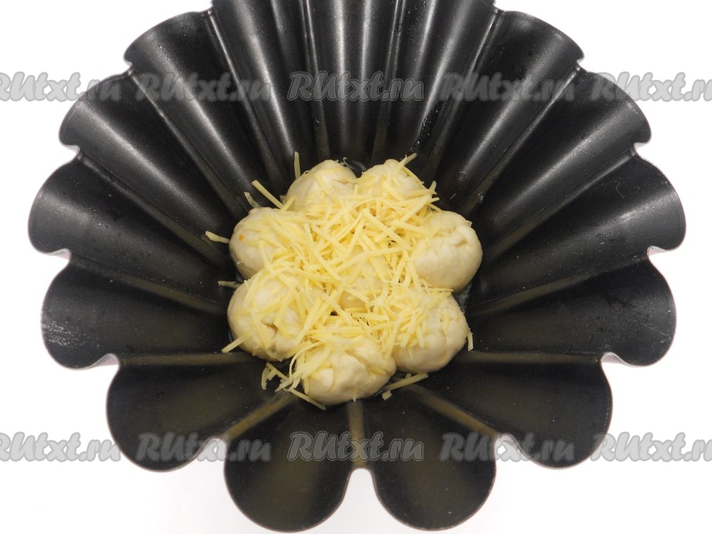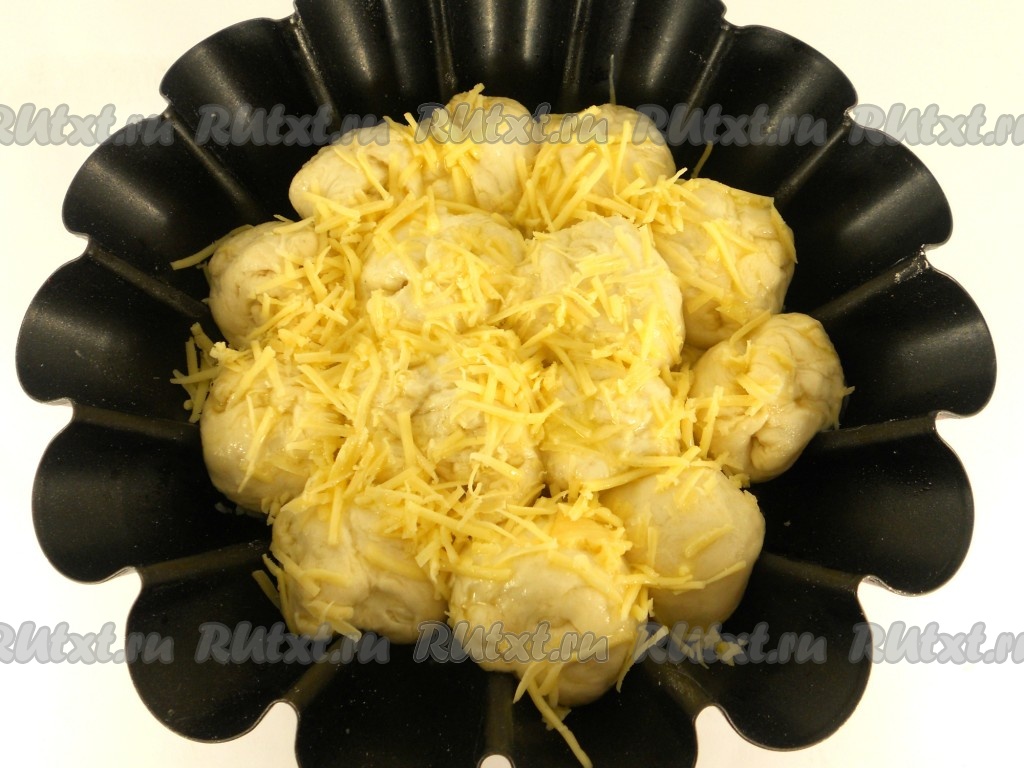 Выкладывать шарики из теста слоями в форму для выпечки диаметром 19-20 сантиметров. Каждый слой посыпать натёртым сыром.