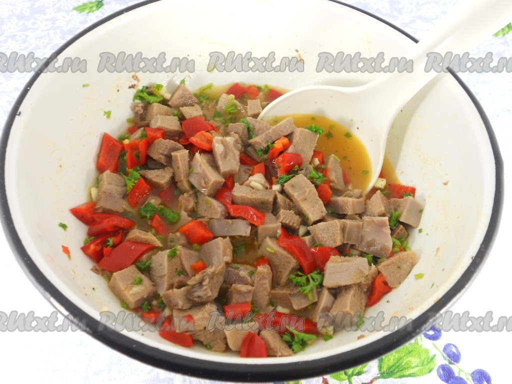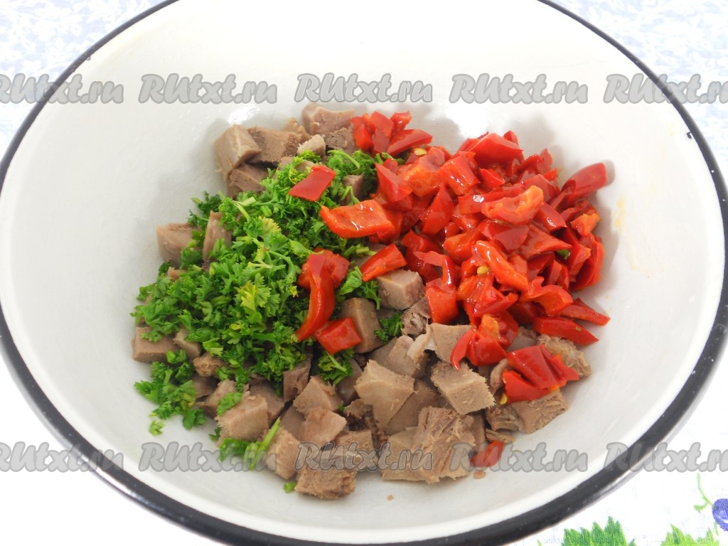 Готовые свиные языки сразу залить на несколько минут холодной водой и очистить. Дать полностью остыть и порезать небольшими кубиками. Добавить измельченную петрушку и порезанный маленькими кусочками вяленый сладкий перец без масла (или вяленые помидоры).