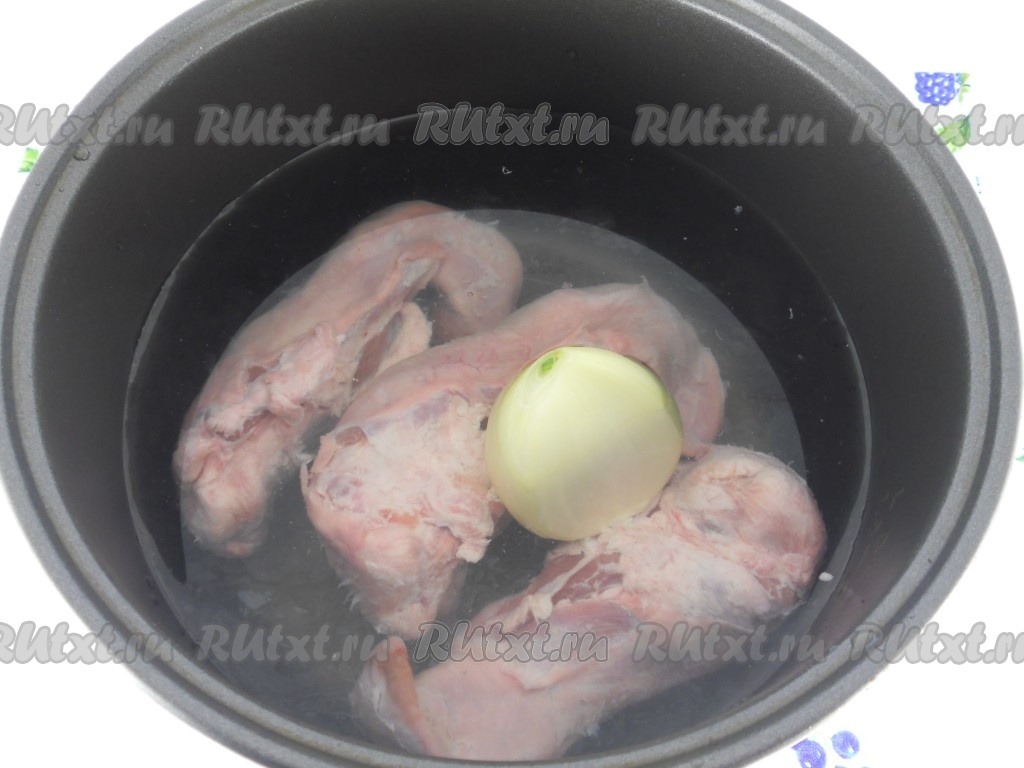 Поместить в кастрюлю вместе с целым очищенным репчатым луком. Залить водой (2-2,5 литра), довести до кипения, убрать пену, посолить по вкусу. Варить на слабом огне 2 часа. Я варила языки в мультиварке. Для этого языки поместить в чашу мультиварки с луковицей, залить 2 литрами воды. Посолить. Выставить режим "Холодец" на 2 часа.