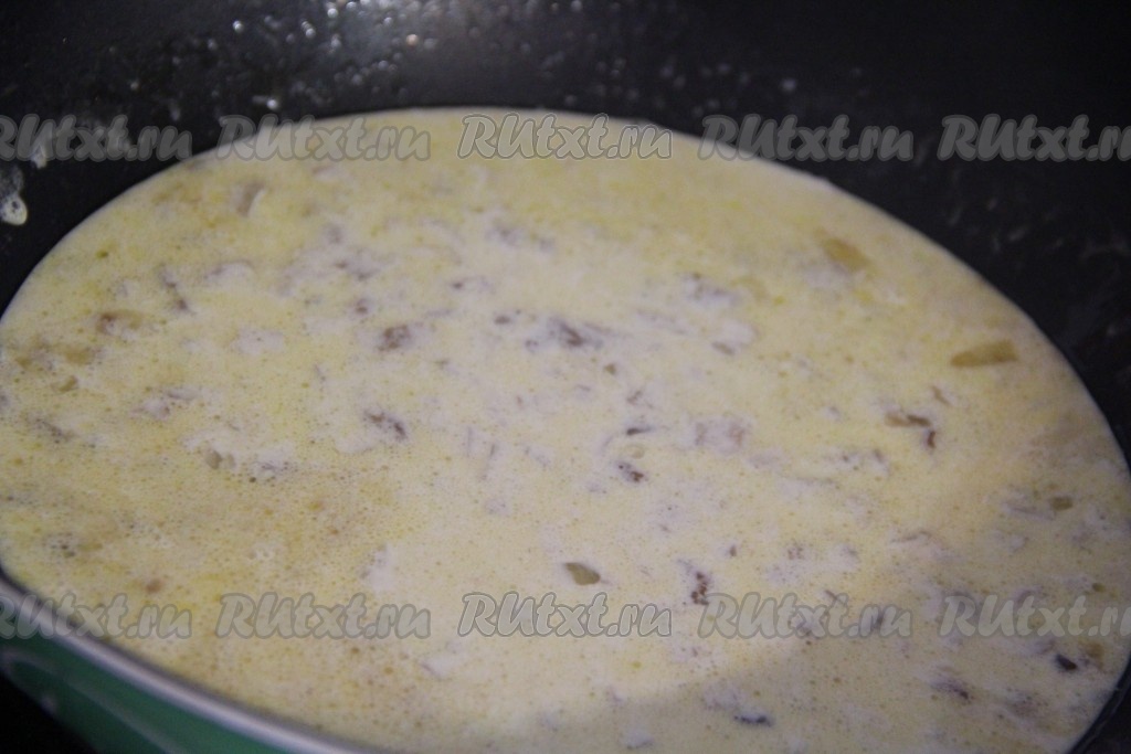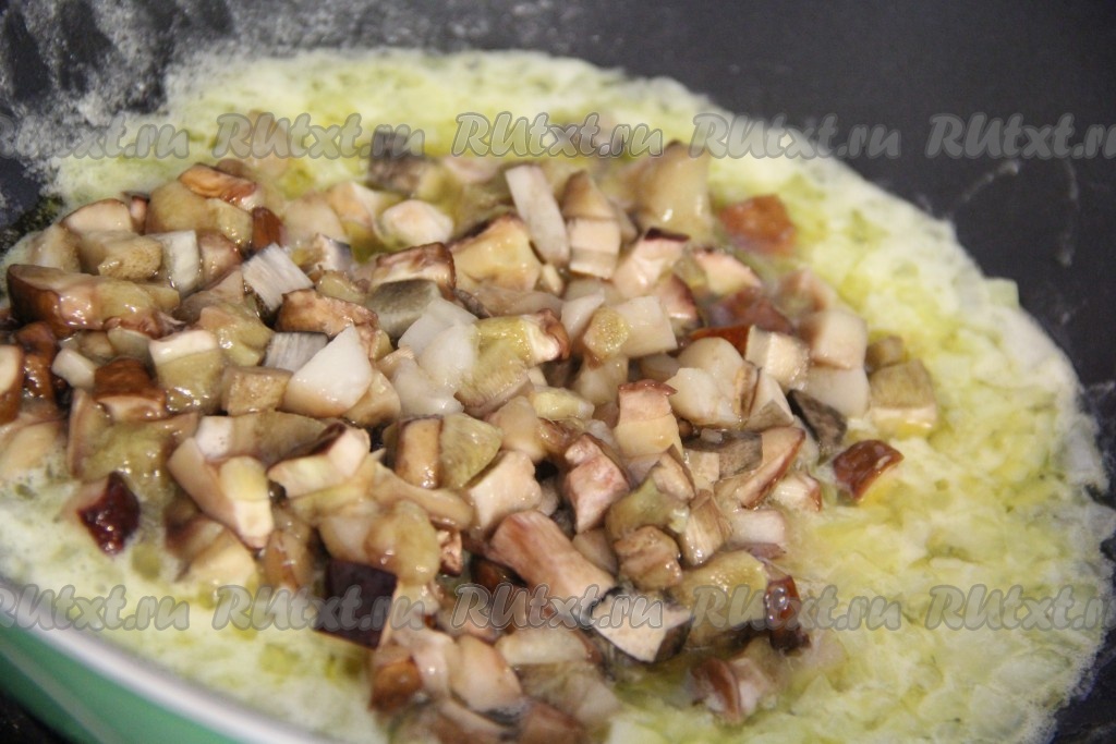 Добавить грибы в сковороду, перемешать и жарить, помешивая, минут 10.