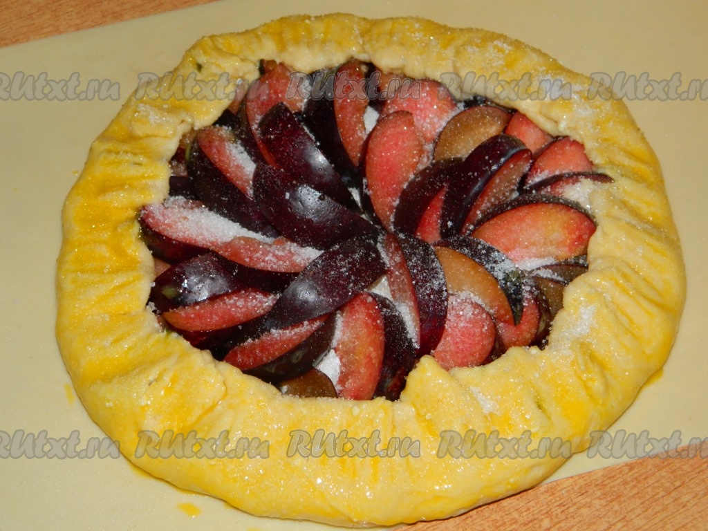 3-4 сливы нарезаем на дольки и выкладываем в центр круга - там где присыпали крахмалом. Затем края заворачиваем на начинку, формируя галету. Смазываем взбитым желтком пирог и присыпаем его сверху сахаром. Выпекаем творожную галету со сливами в разогретой духовке при температуре 200 градусов минут 30.