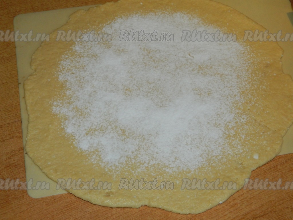 Творожное тесто, собравшееся в ком, делим на 2 равные части (мы будем выпекать 2 галеты со сливами). Противень застилаем бумагой для выпечки (или силиконовым ковриком). На застеленный противень перекладываем одну часть теста и раскатываем в круг (очень тонко раскатывать не нужно). Если раскатывать тесто не на противне, то нежное раскатанное тесто с начинкой будет достаточно сложно перенести на противень. Середину круга присыпаем 1 столовой ложкой крахмала (крахмал не даст сливам сделать низ галеты влажным).