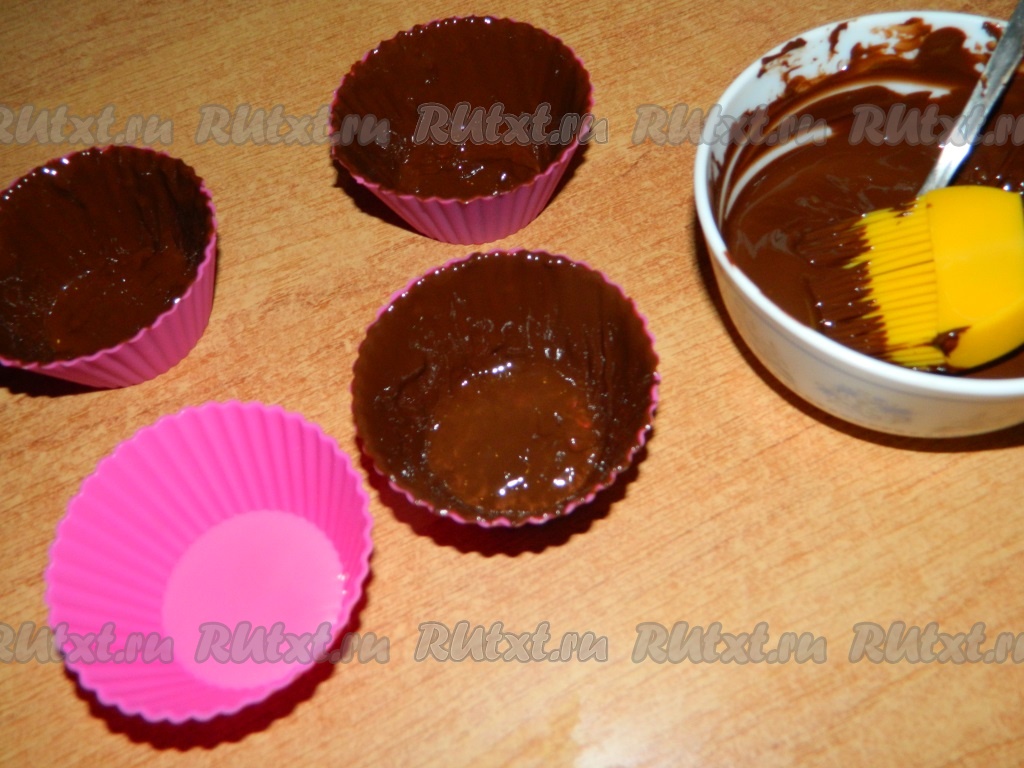 Смазать растопленным шоколадом силиконовые формочки. Поставить формочки в холодильник, чтобы шоколад застыл и смазать ещё раз слоем шоколада, дать застыть в холодильнике. Для надежности я покрыла 3 слоями шоколада.
