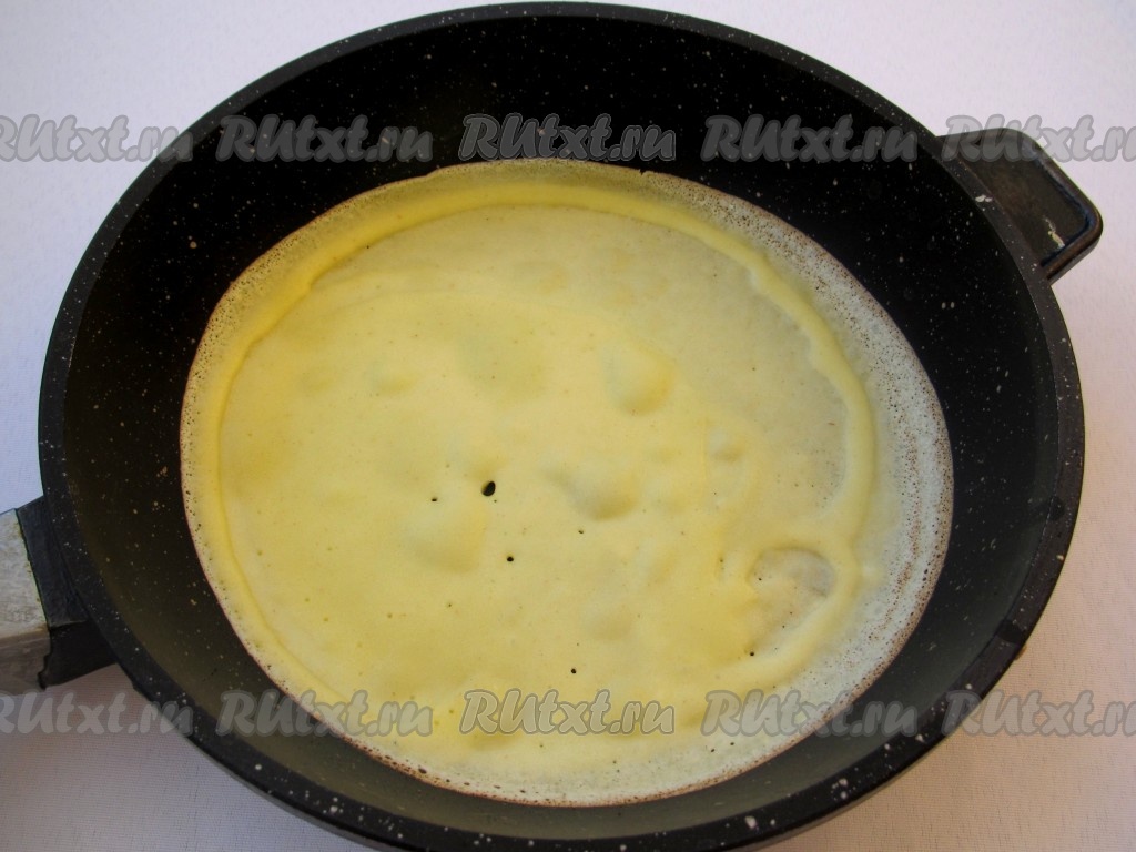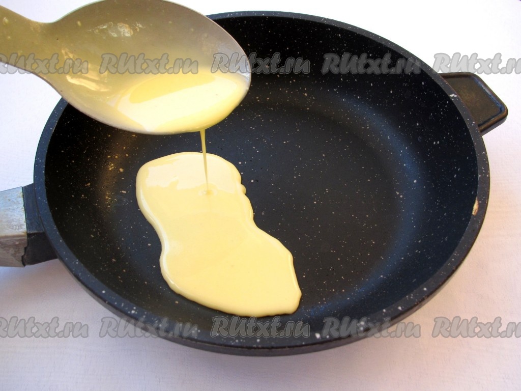 Разогрейте блинную сковородку, слегка смажьте её маслом и накалите. Тонкой струйкой влейте тесто на сковородку и сформируйте тонкий блин, покачивая сковороду из стороны в сторону.