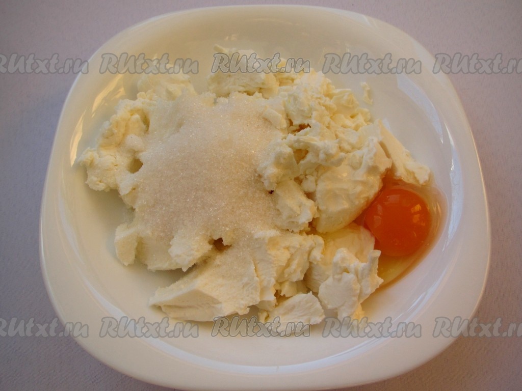 Приготовьте творожную начинку, для этого в творог добавьте куриное яйцо и сахар, разотрите вилкой в однородную массу.