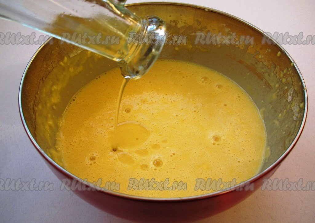 Влейте подсолнечное масло и хорошо перемешайте. Подсолнечное масло добавляется в блинное тесто, чтобы блины во время выпечки не прилипали к сковороде.