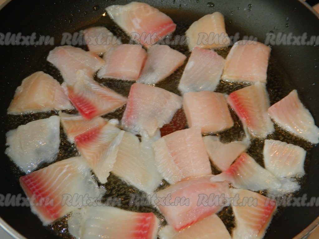 Филе рыбы режем на кусочки. На разогретую сковороду наливаем растительное масло, выкладываем кусочки рыбы и в течение нескольких минут обжариваем с одной стороны до золотистой корочки.