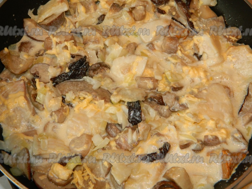 Вливаем сливки, добавляем натертый сыр, перемешиваем, накрываем крышкой и тушим на маленьком огне минут 20.