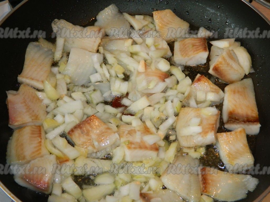 Затем рыбку переворачиваем, добавляем порезанный лук и слегка обжариваем.