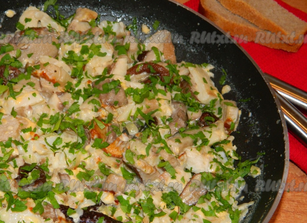 Грибы отправляем на сковороду к рыбе и луку, солим, добавляем специи.
