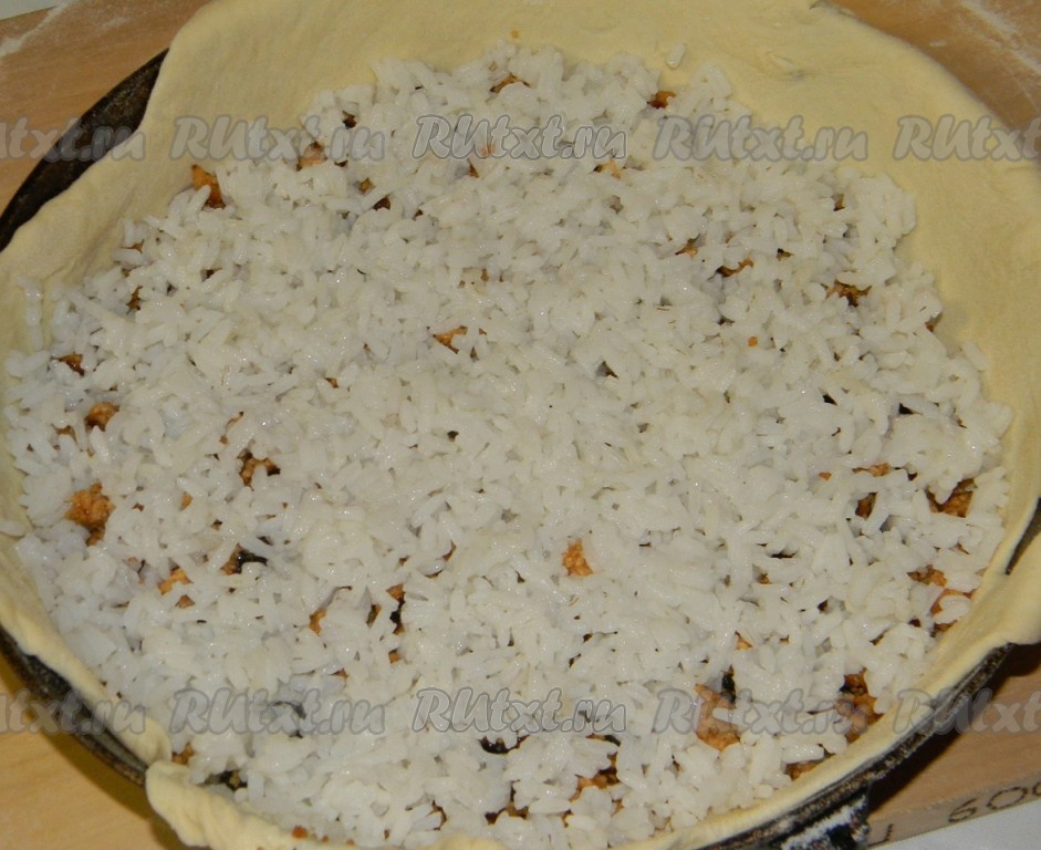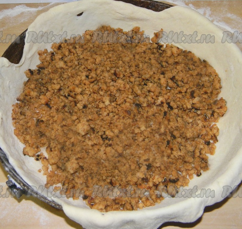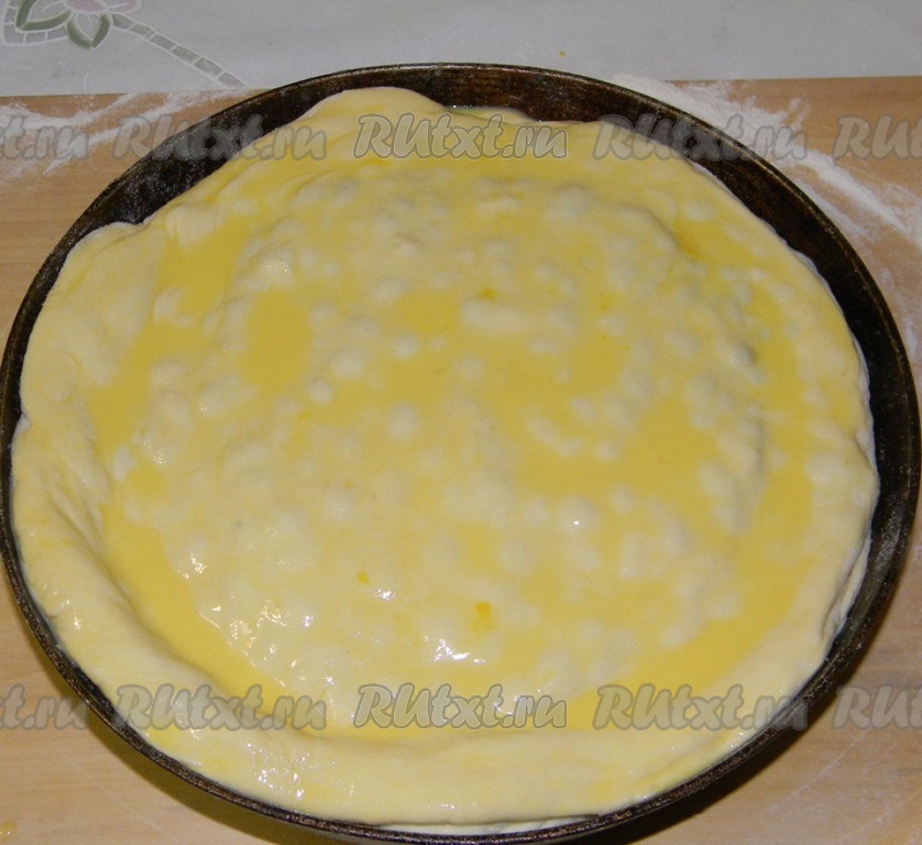 Начинку обильно полить топленым маслом, накрыть второй частью раскатанного теста, края соединить.