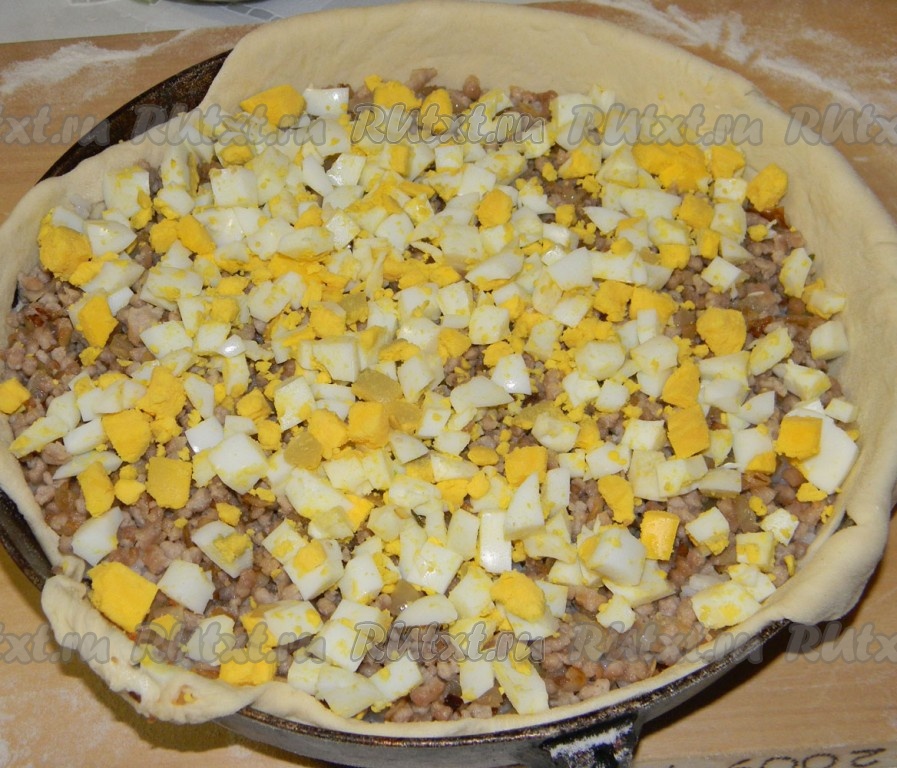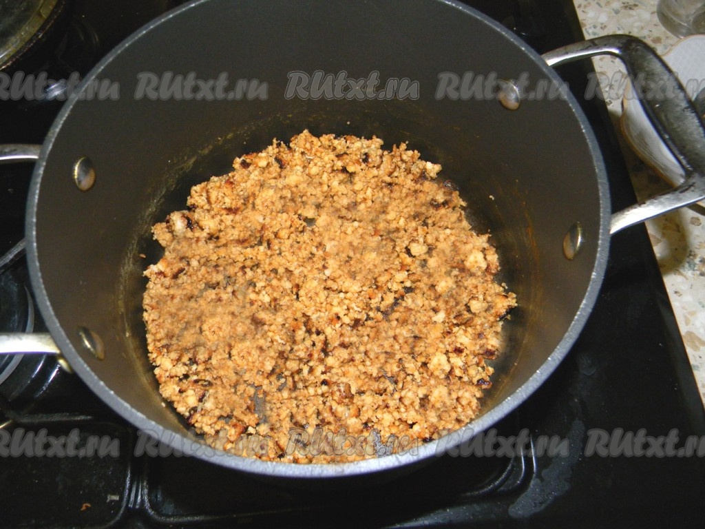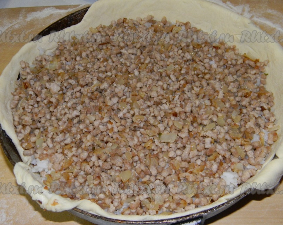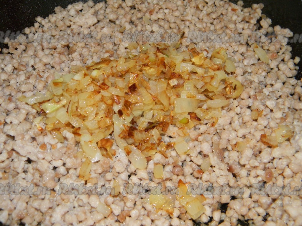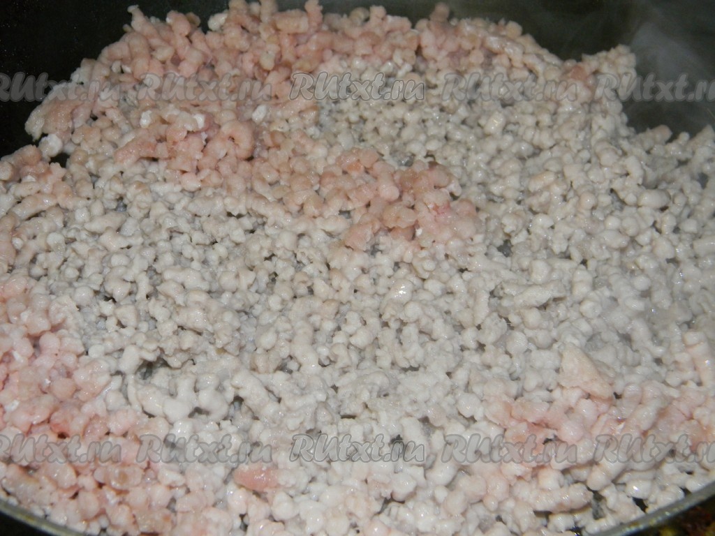 затем - пропущенное через мясорубку поджаренное с луком мясо.