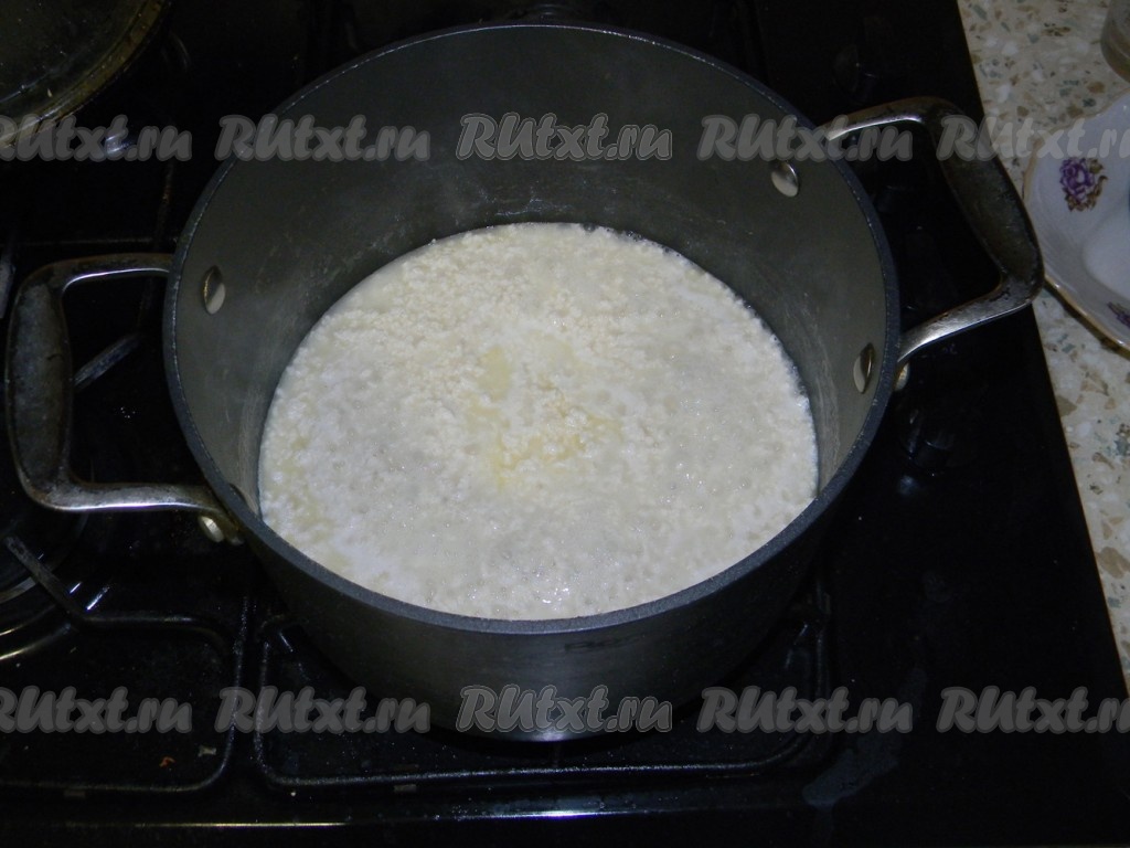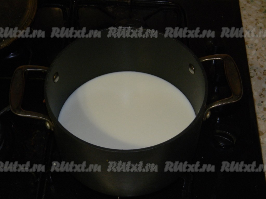 Сначала необходимо приготовить корт. Для этого в кастрюлю с толстым дном налить молоко и довести до кипения.