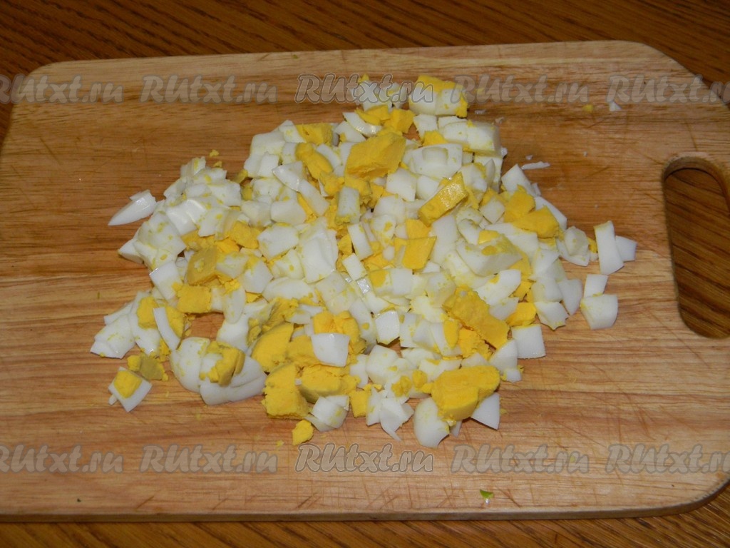 Яйца сварить вкрутую, очистить и нарезать кубиками.