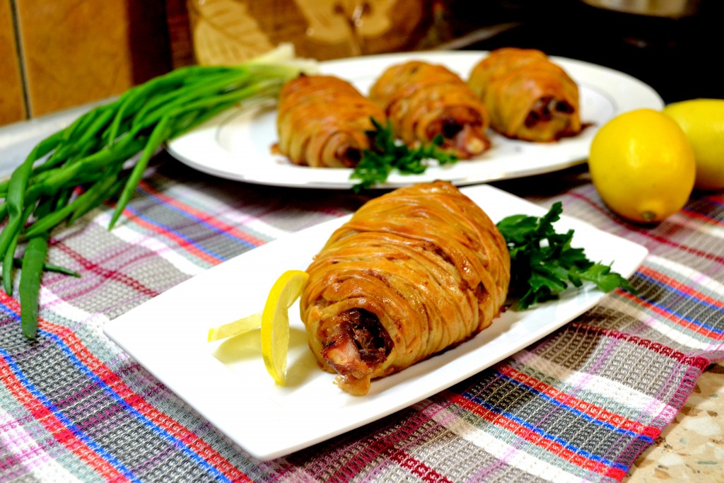 Готовим «веретено» в тесте в хорошо разогретой духовке в течение 30-35 минут до румяной корочки.