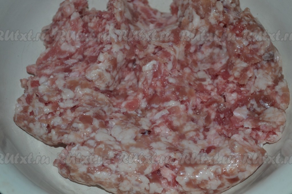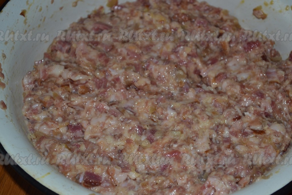 Далее добавить обжаренный лучок, соль, черный молотый перец и снова хорошенько перемешать. Наш фарш готов.