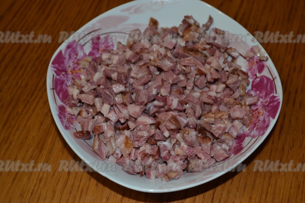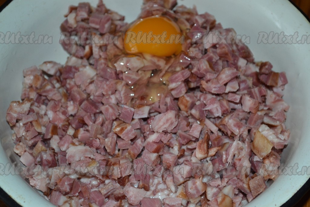 Добавить в него яйцо и порубленное обрезанное копченое мясо, перемешать.