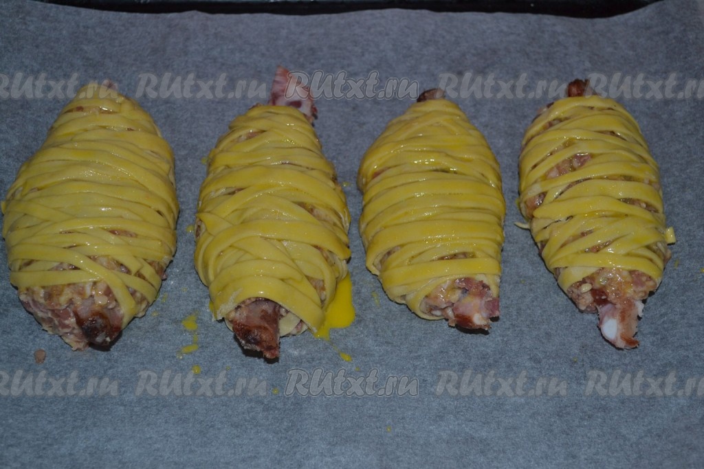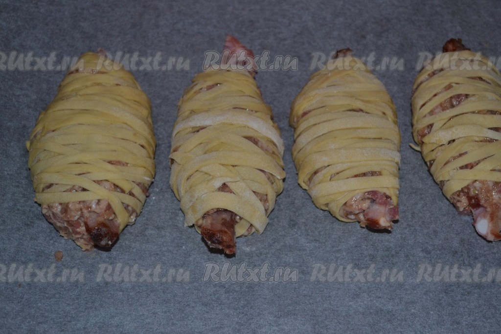 Теперь делим фарш на 4 части (по количеству ребрышек). Берем ребро и формируем вокруг него котлету из фарша. Далее оборачиваем полосочками теста в хаотичном порядке. Выкладываем веретена из мяса и теста на противень, застеленный пекарской бумагой.