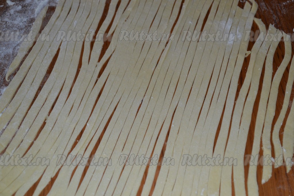 Раскатать его в тоненький пласт и нарезать длинными полосочками шириной 0,7-1 см.