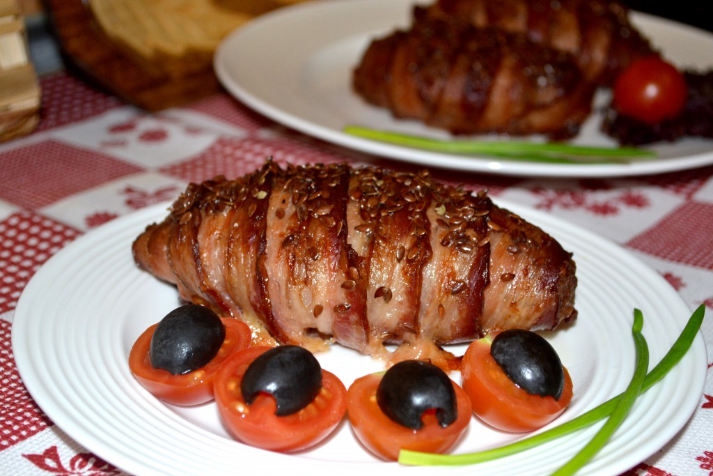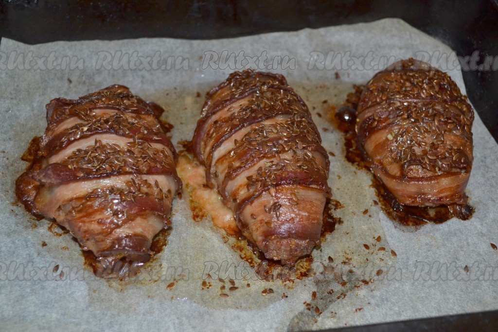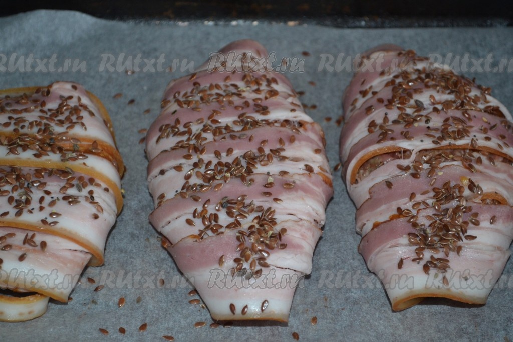 Бекон нарезаем тоненькими полосочками. Выкладываем внахлест друг на дружку.