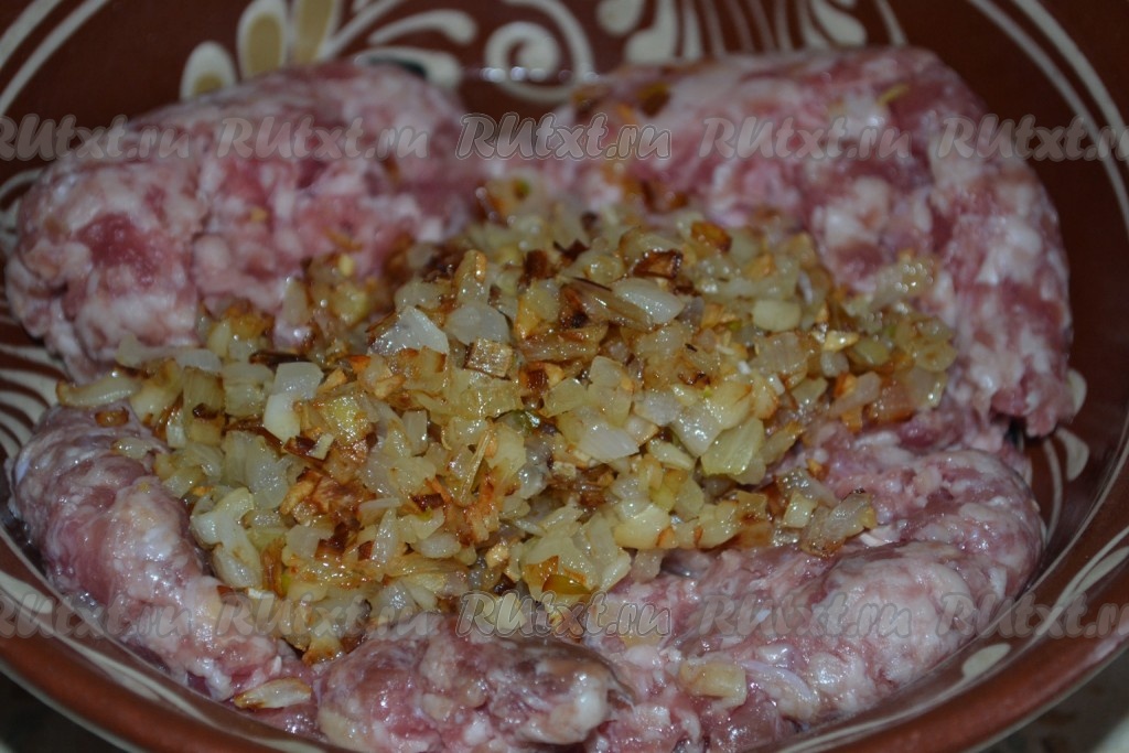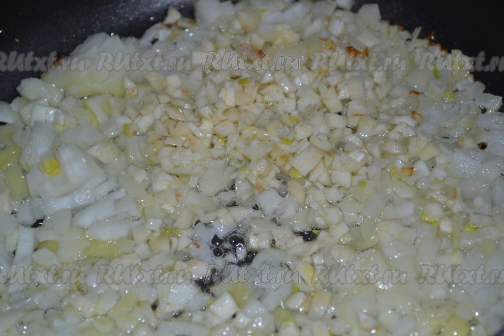 Измельчаем лук с чесноком и обжариваем на растительном масле.