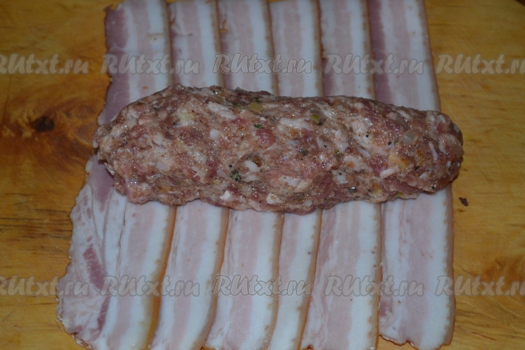 Из фарша формируем колбаски и размещаем на пластиночках бекона.