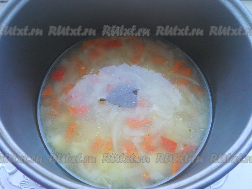 Закрыть крышку мультиварки и выставить программу "Суп" на 1 час. Когда вода закипит, посолить по вкусу и добавить растительное масло. За 10 минут до готовности добавить лавровый лист.