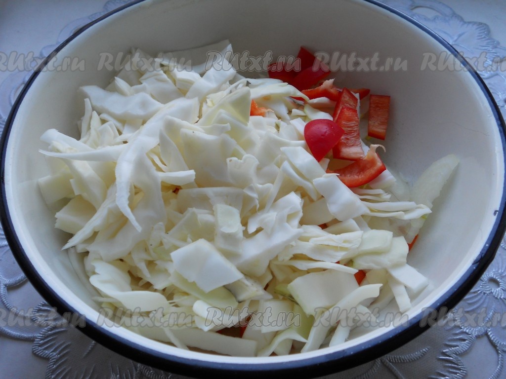 Капусту нашинковать (не тонко), перец сладкий болгарский порезать кусочками. Перец и капусту добавить к остальным овощам.