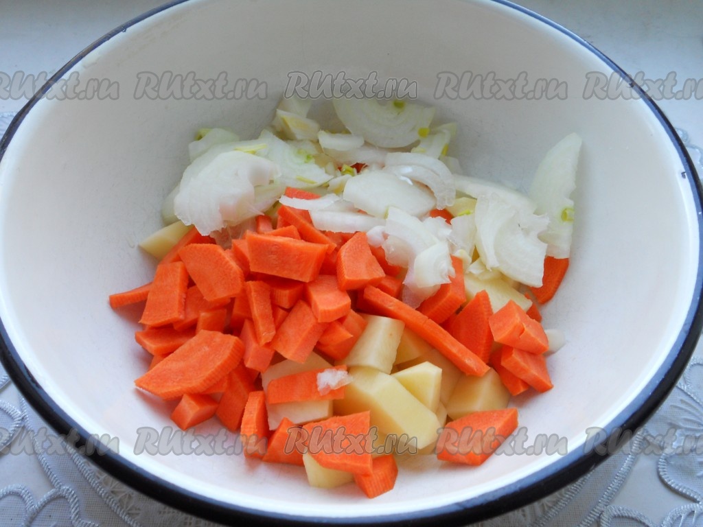 Добавить порезанную кубиками морковь, нарезанный полуколечками или четвертинками репчатый лук.