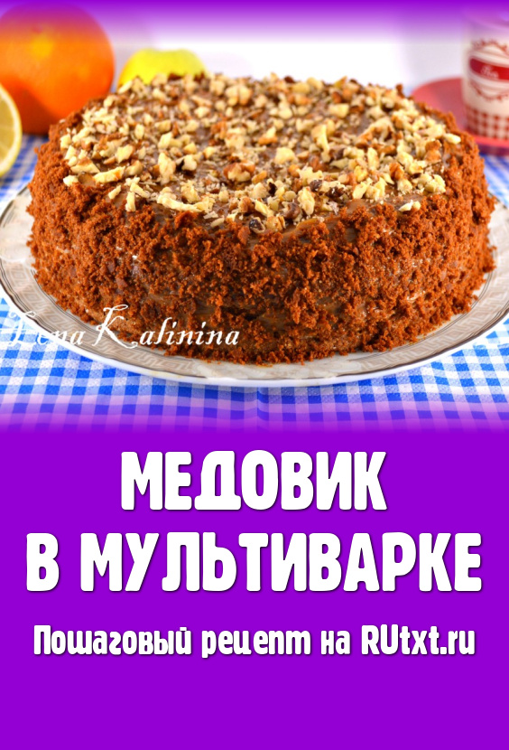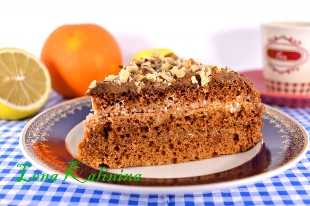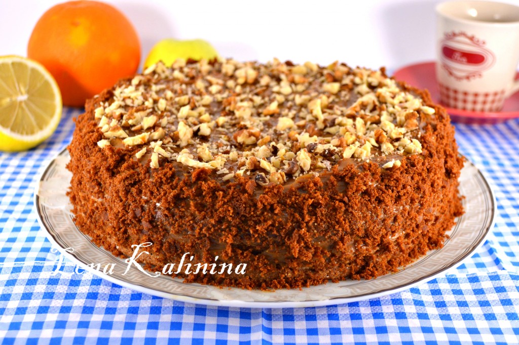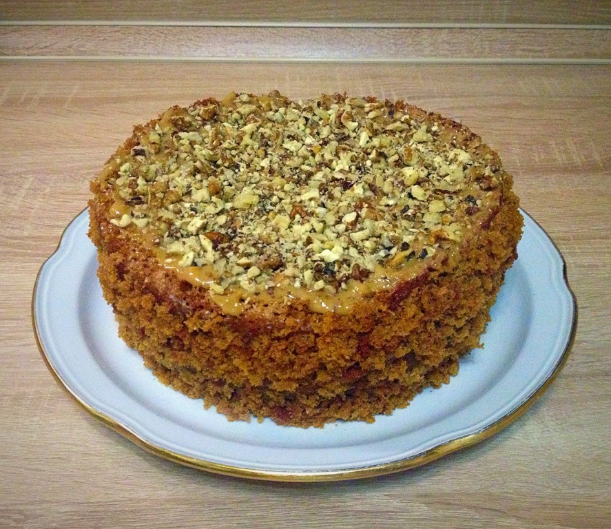 Орехи (у меня - грецкие) измельчить и посыпать ими торт сверху. Поместить замечательный, вкусный торт "Медовик", приготовленный в мультиварке, в холодильник на ночь. Тортик, приготовленный по этому простому рецепту, всегда получается удачным.