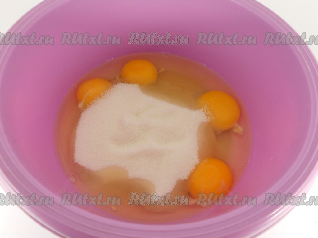 Прежде всего замесим тесто для медового коржа. Для этого в глубокую миску нужно разбить яйца, добавить сахар и соль.