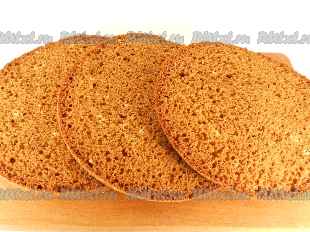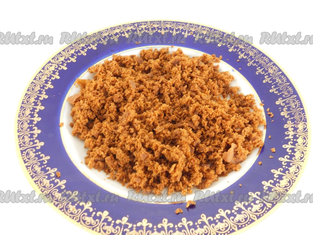 У остывшего коржа срезать тонко подпечённый низ, подсушить его немного в микроволновке (или на сухой сковороде), остудить и размять в крошку.