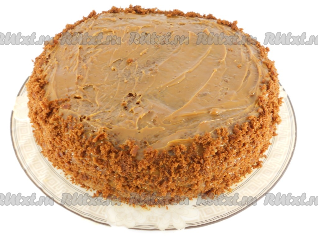 Выложить третью часть коржа. Верх и бока смазать варёной сгущёнкой. Бока обсыпать подготовленной крошкой.
