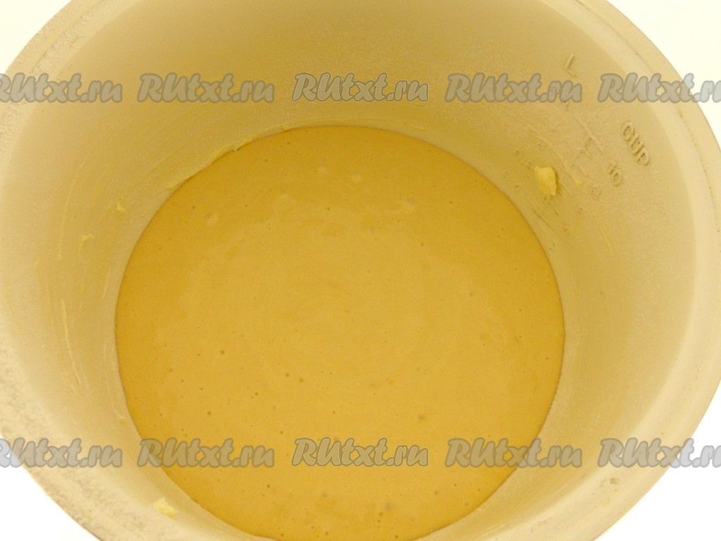 Чашу мультиварки хорошо смазать сливочным маслом, присыпать мукой, затем вылить в неё тесто, крышку закрыть.