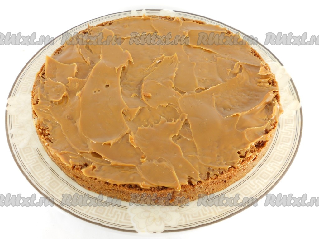 Теперь можно приступать к формированию медовика. Одну часть коржа, испечённого в мультиварке, выложить на плоскую тарелку, смазать частью варёного сгущённого молока.