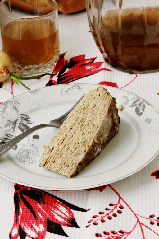 Готовым блинам дать остыть. Отдельно смешать майонез и чеснок, пропущенный через пресс. На плоскую тарелку выложить первый блин, смазать его частью майонезно-чесночного соуса, сверху выложить второй блинчик, тоже смазать его соусом, таким образом, чередуя блины и соус, собрать весь печёночный торт. Поставить получившийся торт хотя бы минут на 30 в холодильник. Печёночный торт, приготовленный с майонезом и чесноком, получается очень нежным и вкусным. А вот какой у него аппетитный разрез.